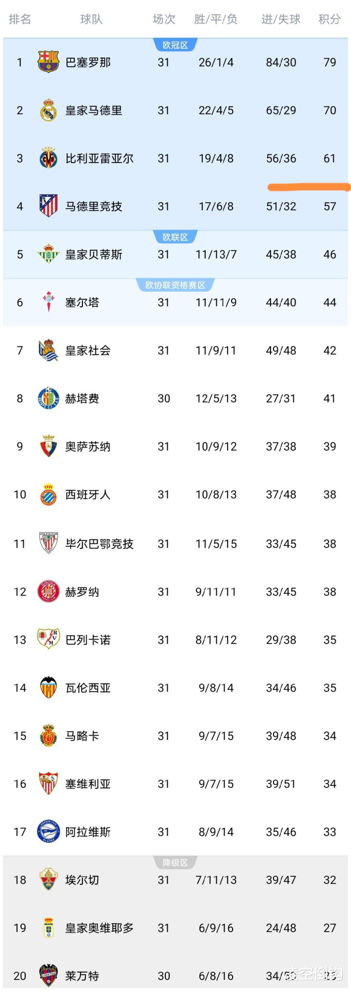 至此西甲积分榜更新:不错看到比利亚雷亚尔赛后积分高潮到了61分,不绝排行第3,贝蒂斯排行第5。