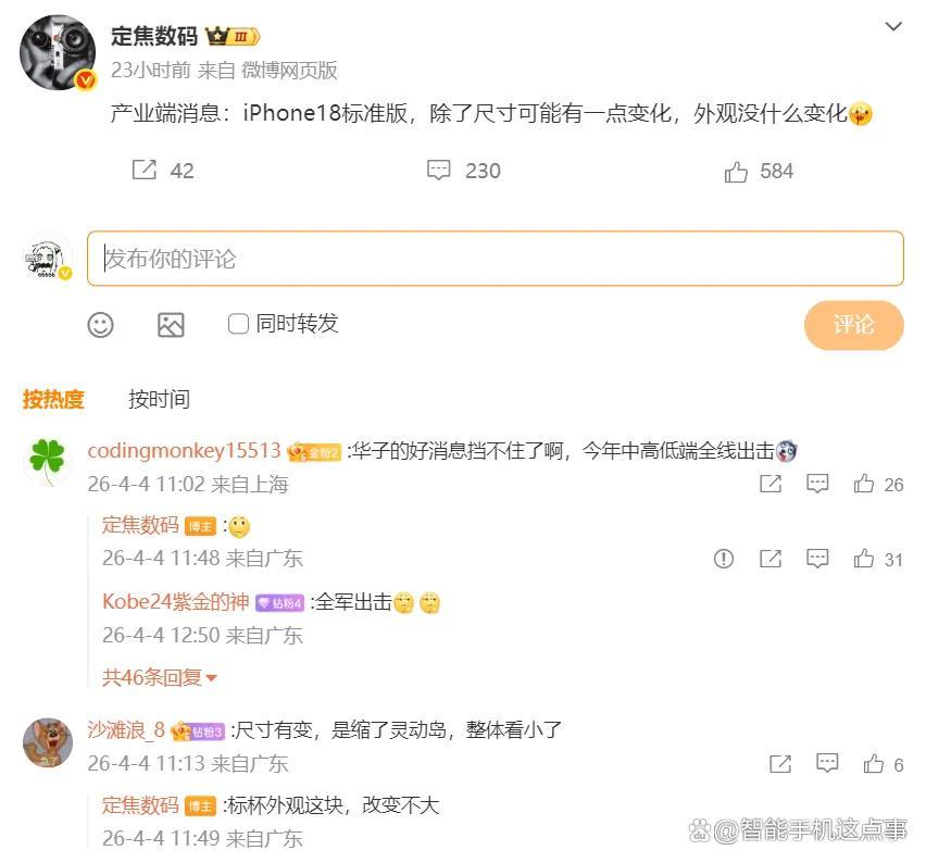 仅仅莫得思到的是,近期的市聚集传出了一好一坏音信,好音信是iPhone 18 Pro系列要大改,坏音信是iPhone18范例版外不雅险些莫得变化。