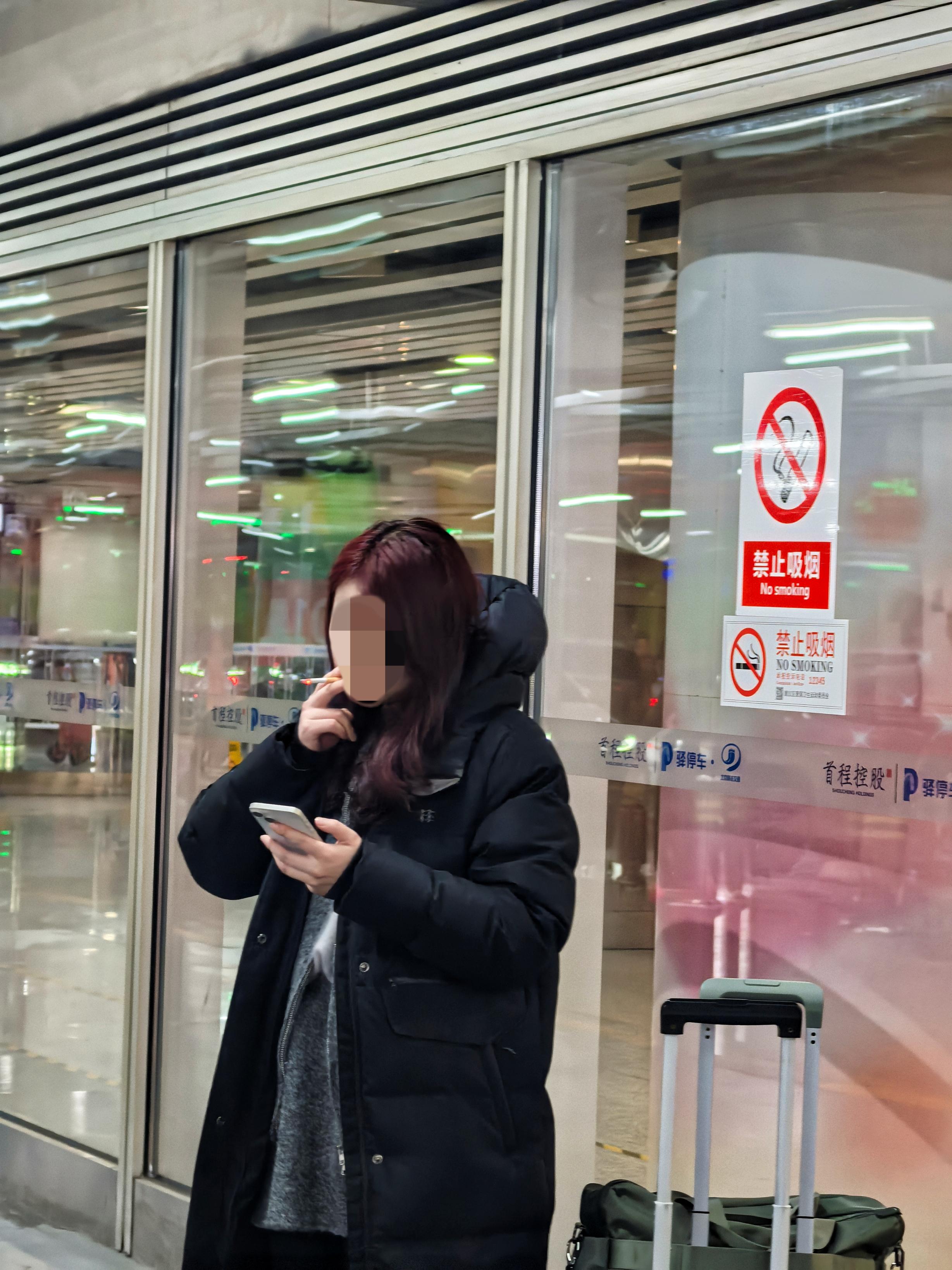 北京向阳站网约车候车区内,有东谈主在辞让抽烟的区域抽烟。