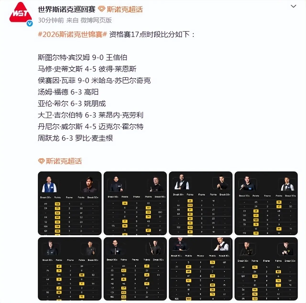 北京期间4月11日,2026年斯诺克世锦赛干涉阅历赛第六比赛日争夺,在领先章程的第一时段各场比赛中,18岁中国小将王信伯被打出惨案,面临天下冠军宾汉姆狂输了一个0-9!此外,15岁的波兰神童苏巴尔奇克不异挂蛋,连丢九局以0-9过期于瓦菲!其余场次,周跃龙6-3麦圭根,汤姆福德6-3高阳,吉尔伯特6-3克劳利,亚伦希尔6-3姚一又成,迈克尔霍尔特5-4丹尼尔威尔斯,彼得莱恩斯5-4马修史蒂文斯。左证赛程安排,以上各场比赛的第二阶段决战将会在次日凌晨2点链接。