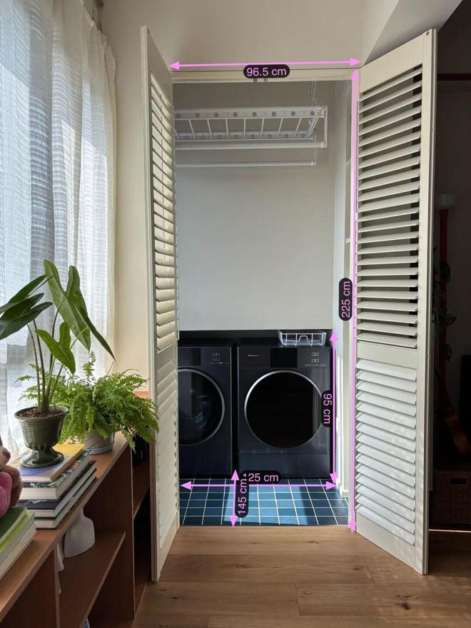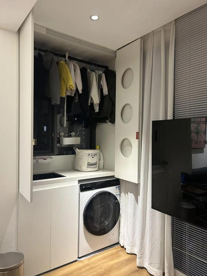 3、将洗衣机和烘干机内嵌进去,并装配上晾衣架,一个隐形的洗衣房就有了。好意思不雅、透风,还惩处了曝晒需求。