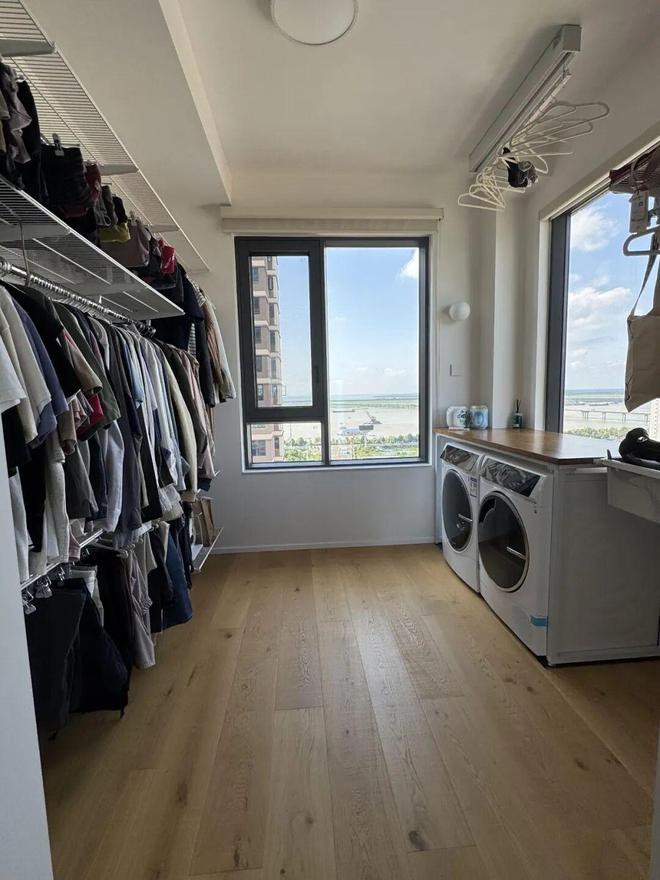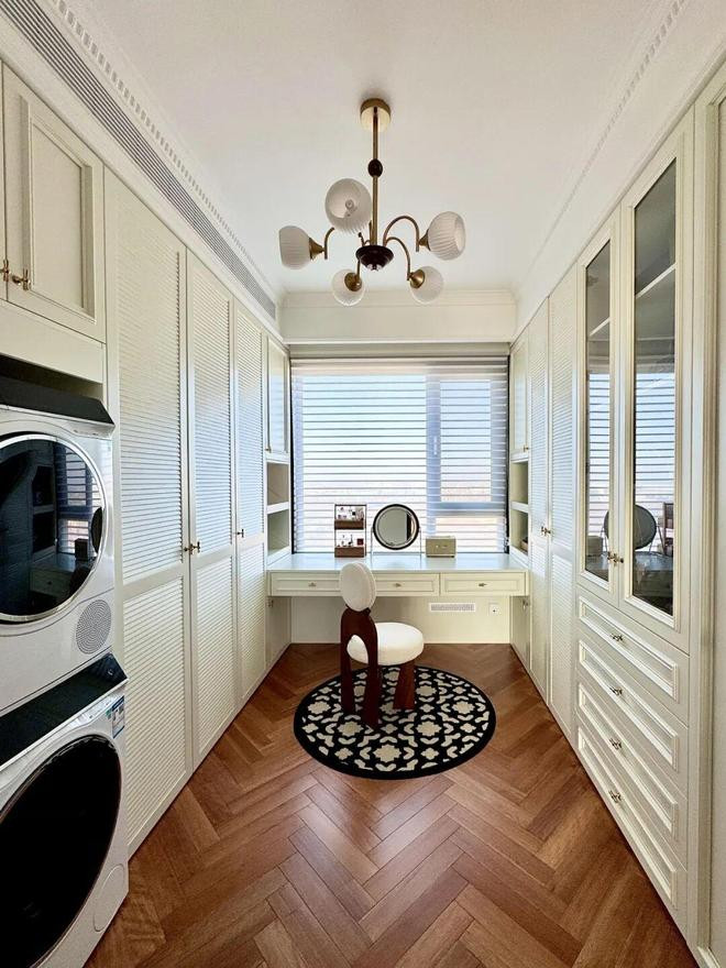 比如「网友@张之大腿」家的衣帽间就在卫生间隔邻,再加上领有双面采光透风条目,就将洗衣机和烘干机放了进去。