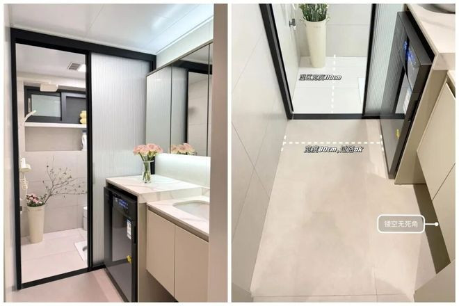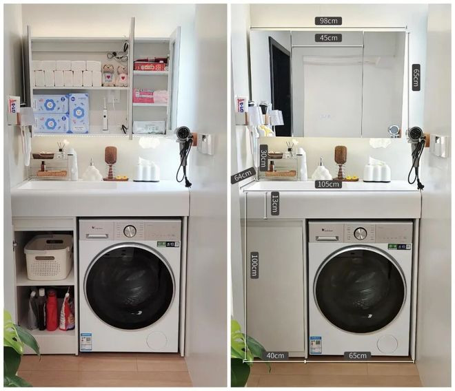 3)将洗衣机放在浴室柜下方,合座高度省略在1m傍边,相宜身高165cm以上的小户型家庭。(台盆的下水口要在双方)