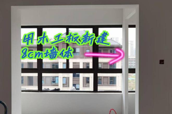 2、新建墙体并蔓延至与阳台墙垛王人平,方便装配隔断门,以及让里面深度达到145cm。
