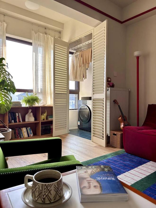 左侧墙面假想洞洞板,方便置物挂东西;右侧墙面假想鞋柜,骄横收纳需求;而临窗摆放的洗衣建筑,则惩处了洗晒需求。