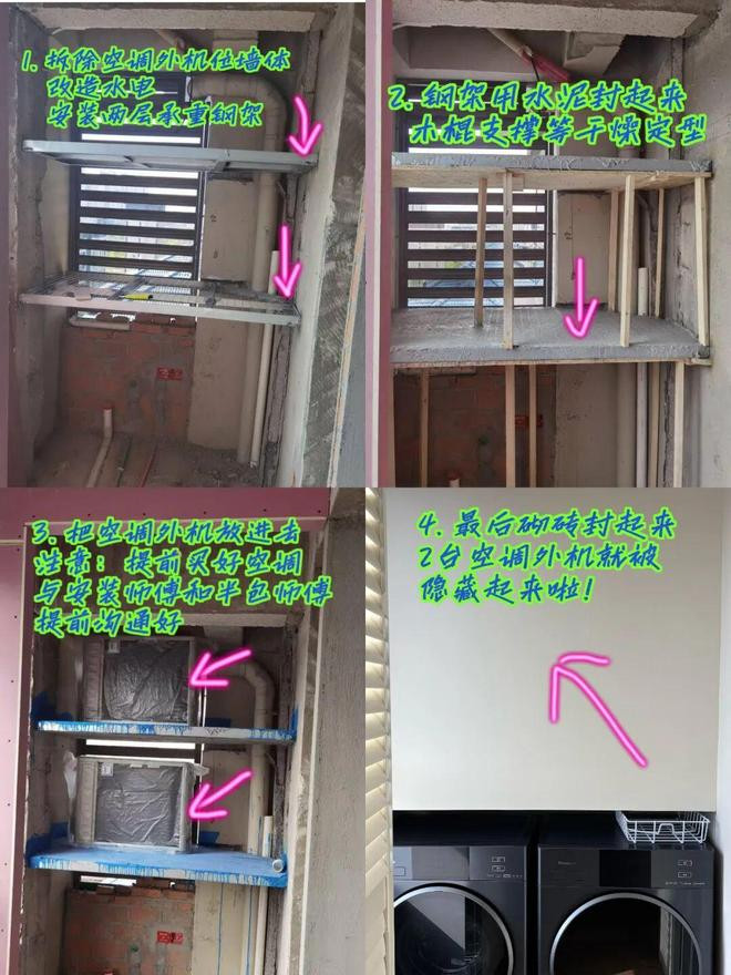 1、拆掉阳台和外机平台之间的墙体,再行装配两层承重钢架,并提前将空调外机装进去,终末再封起来。