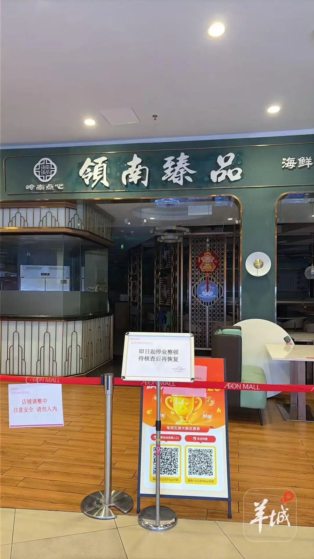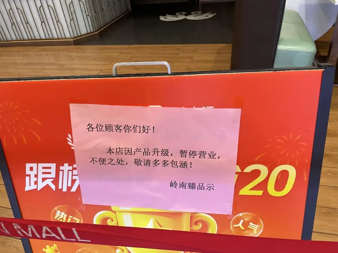 “记者帮”通过多方路线核实,涉事门店为领南臻品·粤菜茶点(永旺店)。4月21日,“记者帮”实地打听该门店,发现门店暂未贸易,门口拉起了红色围栏线。门口还贴有“店铺融合中,夺目安全,请勿入内”等运筹帷幄指示语,其中,有一份指示语为领南臻品示:“本店因产物升级,暂停贸易,未便之处,敬请多多原谅!”